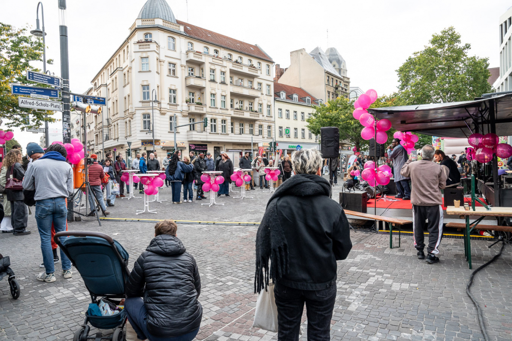 Weiter ging es mit Live-Musik auf dem Alfred-Scholz-Platz. Hier wurde die Outdoor-Ausstellung eröffnet, die seit diesem Tag spannende Ein- und Rückblicke in die Baumaßnahme bietet. Zudem hatten die Besucherinnen und Besucher die Möglichkeit, mit den Planenden in den direkten Austausch zu treten und Fragen zum Umbau zu stellen. Die Bürgerstiftung Neukölln unterstützte hierbei mit ihrem Projekt „Leicht gemacht”. Außerdem auf dem Platz vertreten waren Akteur*innen aus dem Zentrum. So hatte die BSBI, die Berlin School of Business and Innovation, einen Stand aufgebaut, EDEKA hatte sein Glücksrad aufgestellt, der Berliner Büchertisch verschenkte Bücher und der Mitmach-Laden sowie die Lenkungsgruppe informierten und regten zur Beteiligung im Zentrum an.