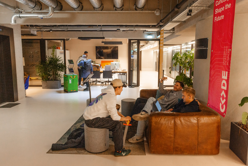 Die Innenräume entstanden in enger Zusammenarbeit mit den Studierenden und strahlen den Charakter moderner Tech-Unternehmen aus: offene Raumstrukturen, gemütliche Sitzmöbel und flexible Arbeitsbereiche. Die Seminar- und Projekträume, die durch Glaswände oder Schallschutzvorhänge voneinander abgetrennt sind, tragen von den Studierenden vergebene Namen wie „Jungle“, „Dark Matter“, „Hans Zimmer“ und „Muted“ – und vermitteln so bereits im Namen ein kreatives und inspirierendes Arbeitsumfeld. In verschiedenen Ecken bieten Spielbereiche, etwa mit Schachbrettern oder einem Tischkicker, Gelegenheit für eine kurze Auszeit. Eine große, offene Teeküche direkt neben einer weitläufigen Terrasse dient als Treffpunkt für Studierende und Lehrende – ein weiterer Baustein für das begegnungsorientierte Klima der Hochschule.