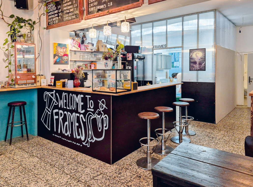 Die Werkstatt und das Café sind durch einen offenen Durchgang miteinander verbunden. In der Mitte steht ein großer Holztisch, der tagsüber zum Coworking einlädt. Am Abend wird der Raum zur Bühne für Konzerte, Lesungen oder Tanz. Die Einrichtung trägt Spuren ihrer Geschichte – rohe Wände, alte Bodenfliesen, selbst ausgebaut im Industrial-Stil.