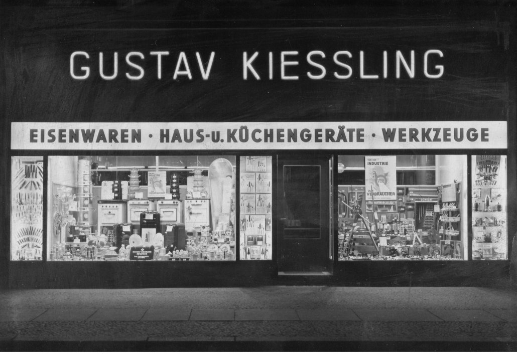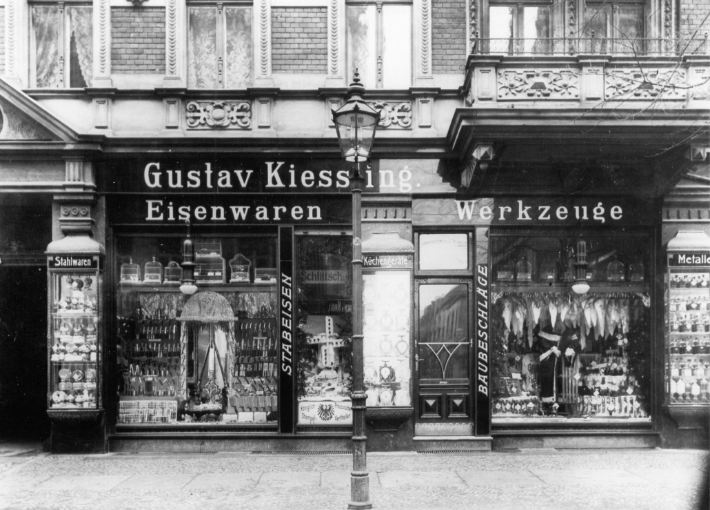 Modernisierte Schaufenster des Eisenwaren- und Haushaltsgeschäfts „Gustav Kiessling“ in der Berliner Straße, um 1905 und in den 1950er Jahren