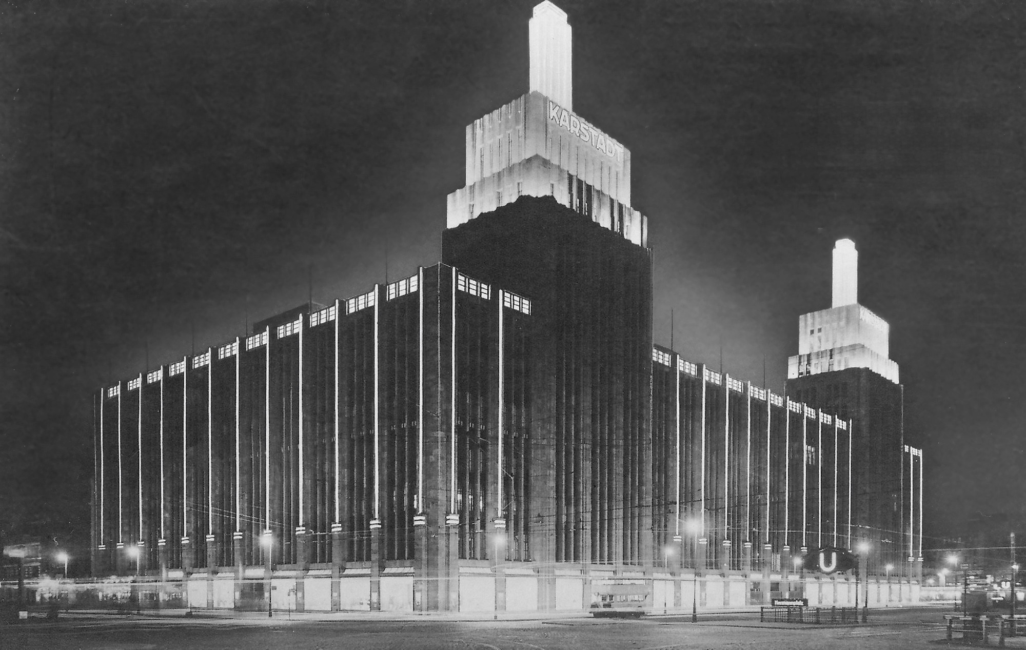 Eine eindrucksvolle Lichtinszenierung setzte sich bei der Errichtung des Kaufhauses Karstadt am Hermannplatz fort, das vor allem auch mit seinen überwältigenden Dimensionen beeindruckte. Die beiden 56 Meter hohen Türme wurden zusätzlich von 15 Meter hohen Lichtsäulen bekrönt. Stilistisch war es von der US-amerikanischen Hochhausarchitektur beeinflusst. An beiden Gebäuden wurde Licht eingesetzt, um die moderne Geradlinigkeit der Baukörper zu betonen. Es wurde somit als Teil der Fassadengestaltung eingesetzt. Nachts leuchtete das Kaufhaus nicht nur kilometerweit, sondern der Baukörper des Kaufhauses schien sich sogar vollständig aufzulösen.