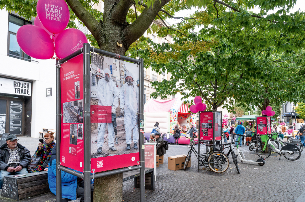 Nach den offiziellen Eröffnungsreden auf dem Rathausvorplatz wurde auf dem Alfred-Scholz-Platz bei Live-Musik bis in den Abend weitergefeiert. Hier fand die Eröffnung der Outdoor-Ausstellung statt, die spannende Ein- und Rückblicke in die Baumaßnahme bot. Zu sehen war sie ab dem Veranstaltungstag und bis in den November hinein. Zudem hatten Besucherinnen und Besucher die Gelegenheit, mit den Planenden in den direkten Austausch zu treten und Fragen zum Umbau zu stellen. Die Bürgerstiftung Neukölln unterstützte hierbei mit ihrem Projekt „Leicht gemacht”.