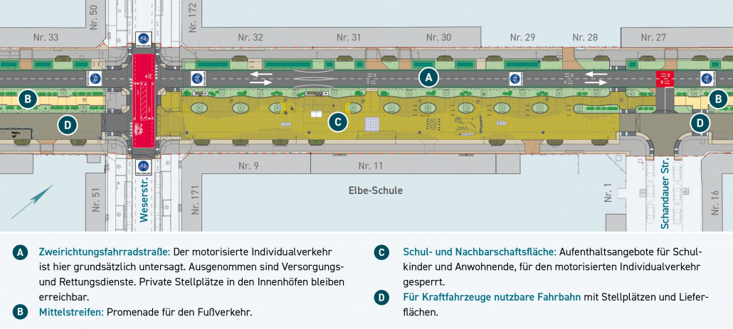 Nach Abschluss der Beteiligungsphase im Sommer dieses Jahres werden nun die Bauplanungsunterlagen fertiggestellt. Der eigentliche Umbau der Elbestraße ist für den Zeitraum Ende 2026 bis 2029 geplant. Ziel ist es, eine lebendige, sichere und grüne Straße zu schaffen, die den Bedürfnissen aller Verkehrsteilnehmenden gerecht wird, den klimatischen Anforderungen entspricht und mehr Aufenthaltsqualität bietet. Zu diesem Zweck werden auf der Westseite eine Zweirichtungsfahrradstraße und Mulden zur Versickerung von Regenwasser angelegt, auf dem Mittelstreifen eine Fußgängerpromenade errichtet und vor der Elbe-Schule eine Schul- und Nachbarschaftsfläche geschaffen. Darüber hinaus werden neue Bäume gepflanzt, mehr Sitzmöglichkeiten geschaffen und zusätzliche Mülleimer aufgestellt.