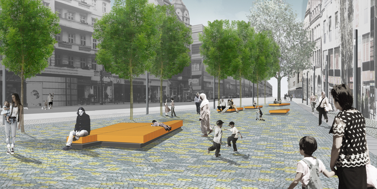 Für Aufenthaltsqualität sorgen Sitzmöbel, die Pflanzung zehn neuer Bäume sowie die alte Platane, die selbstverständlich erhalten blieb. Die Steinsorten des neuen Pflastermosaiks stehen symbolisch für die acht Herkunftsregionen der Neuköllner*innen (Deutschland, Naher/Mittlerer Osten, Osteuropa, Westeuropa, Ungeklärte Herkunft, Afrika, Ferner Osten und Amerika).
