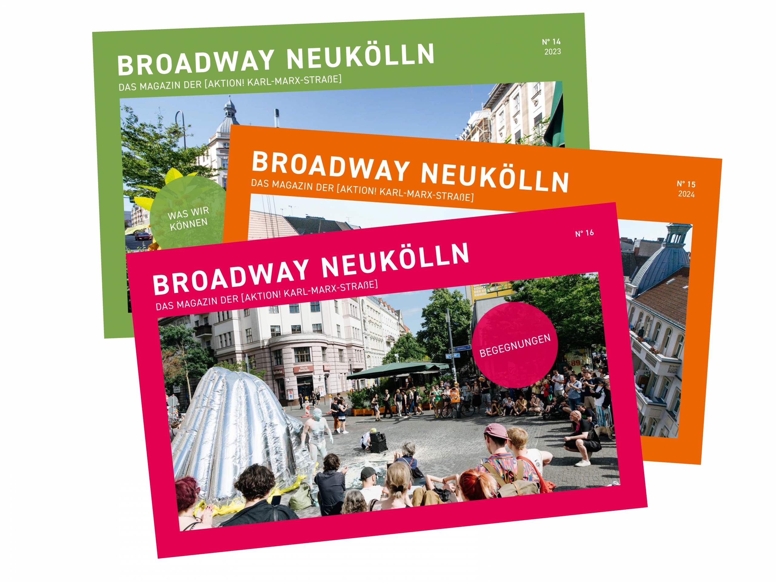 Das Magazin BROADWAY Neukölln erscheint seit 2008 einmal im Jahr und wirft einen Blick hinter die Kulissen des Gebiets der [Aktion! Karl-Marx-Straße]. Die Entwicklungen im Bezirkszentrum werden unterhaltsam und vielseitig aufbereitet und reflektiert. Immer wieder stehen dabei die Menschen, die hier wohnen und arbeiten, im Mittelpunkt.